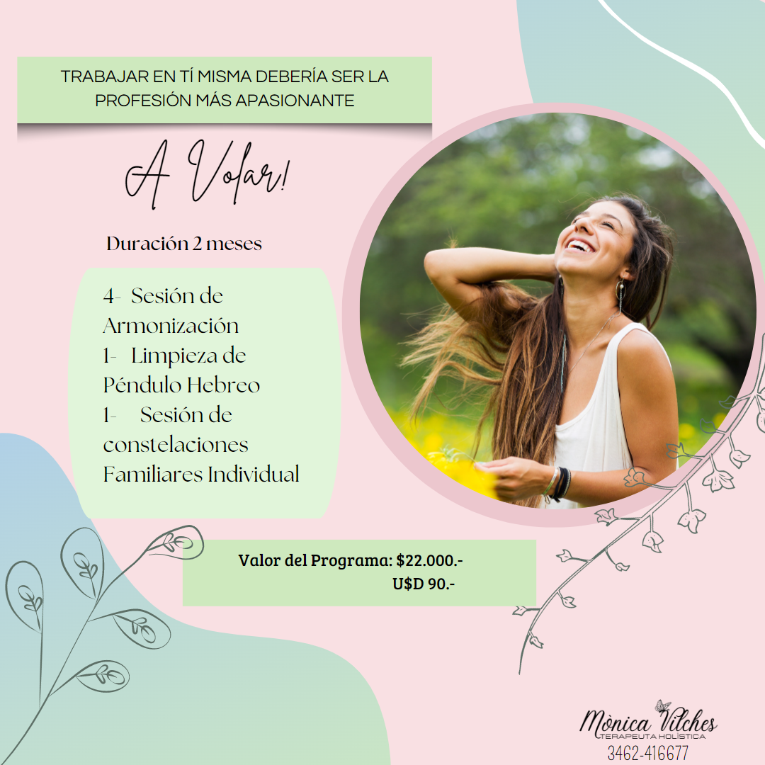 Programa A Volar te garantiza el Bienestar, consiste en 4 sesiones de Armonización 1 limpieza de Péndulo Hebreo, y una sesión de Constelación Familiar Individual. Donde podrás Armonizar, limpiar y entender el porqué de tu síntoma.